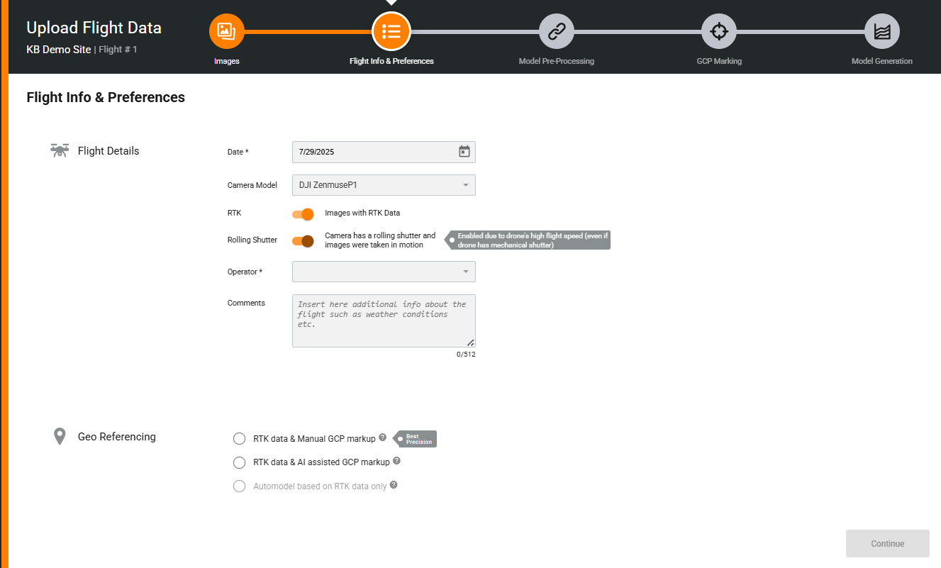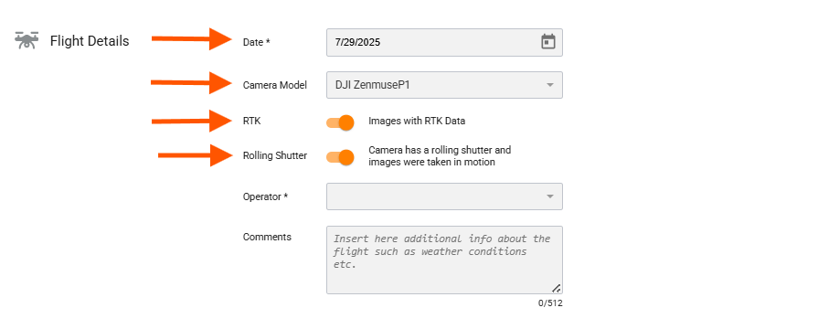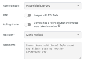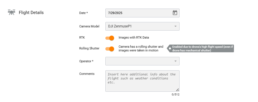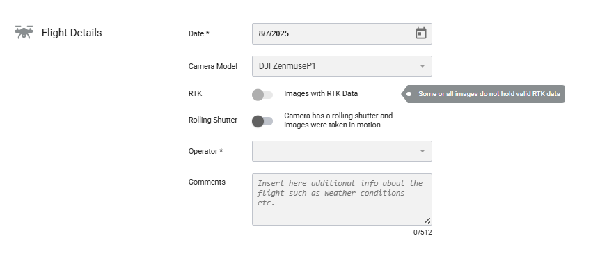 Flight date, camera model, RTK status, and rolling shutter settings are automatically extracted from the images.