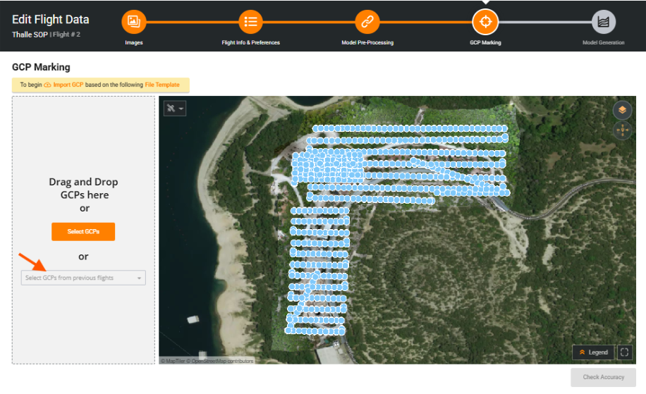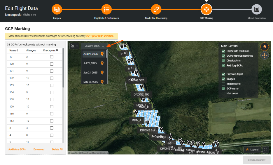Tip: If you have multiple previous flights, you can select which one to reference for consistent marking. This will serve as a guide for where your GCPs have historically been marked as you are marking them for your new flight.