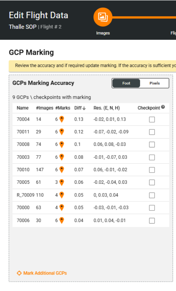 - Click on the GCPs with the highest Diff to review the markings you made.