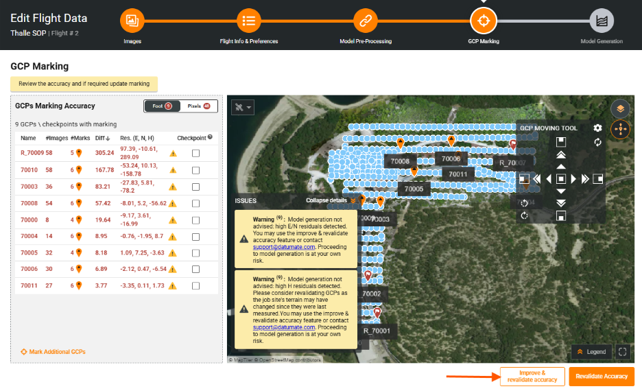 - Even if you made no adjustments, you will have the "Improve and revalidate accuracy" button available here. This button will check a combination of several parameters and use the best one to improve accuracy of the markings.