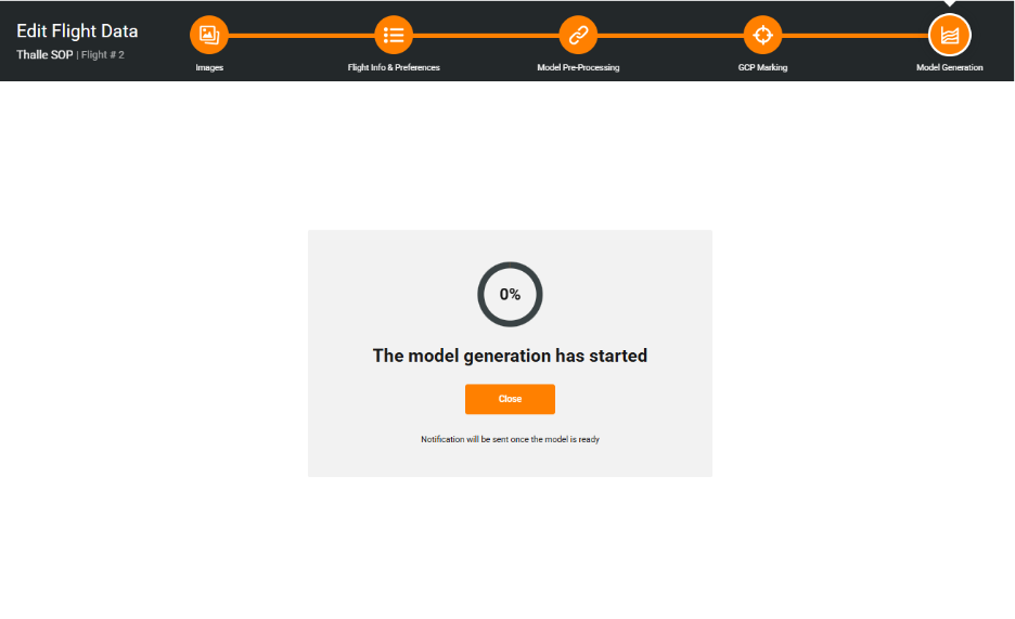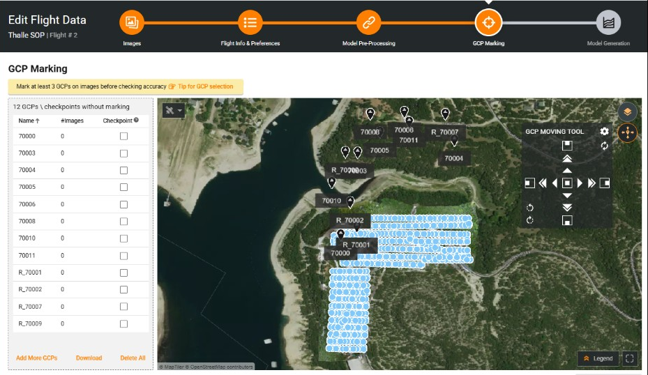 Once your images are uploaded and the model has finished pre-processing, the next and final step to generate a model will be to mark your ground control points (GCPs), if you have selected a geo-referencing option that requires it.