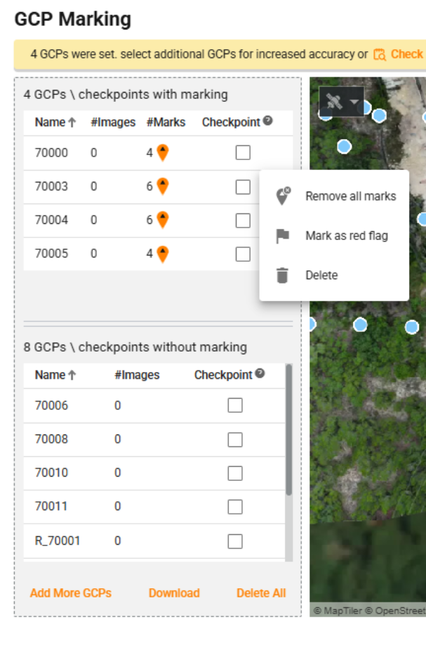 - You can also remove all marks from a GCP on your menu of GCPs, by clicking on the three dots next to your GCP: